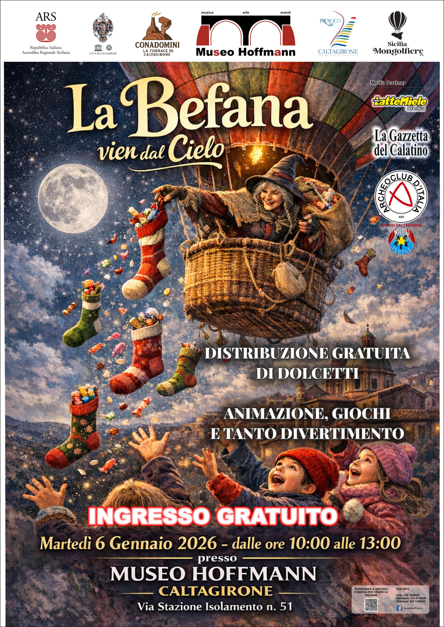 A partire dalle ore 10:00 fino alle 13:00, presso il Museo Hoffmann di Caltagirone, la Befana arriverà in un modo davvero spettacolare: dal cielo, a bordo di una mongolfiera, pronta a distribuire cioccolatini e caramelle ai bambini presenti. Inoltre, chiunque voglia volare in mongolfierà, potrà farlo prenotandosi preventivamente ai numeri riportati sotto.